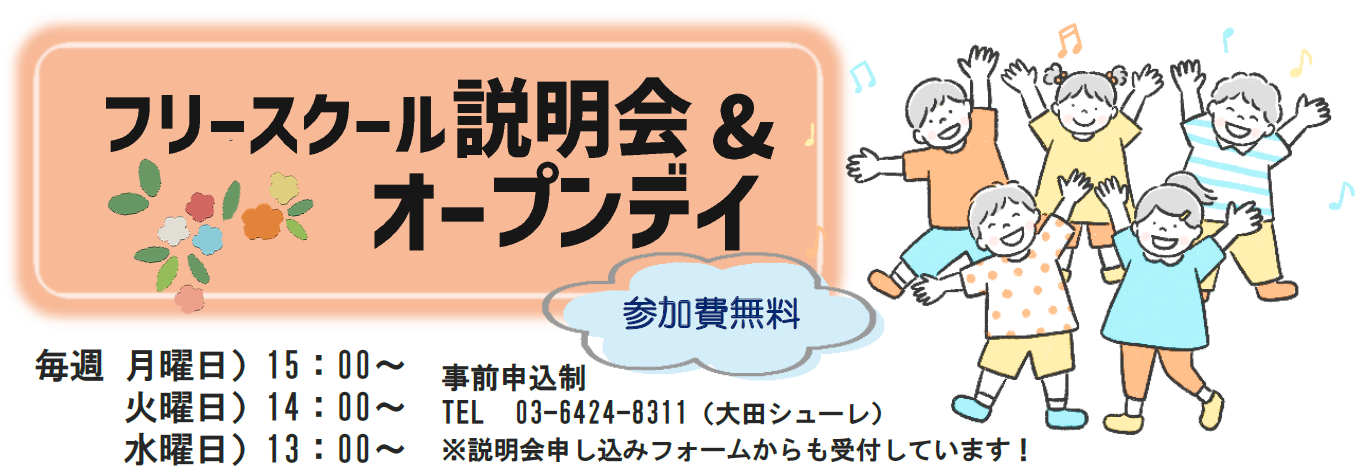 東京シューレ大田では、毎週 火・水曜日に、保護者向け説明会ならびに、フリースクール体験・見学オープンデイを開催しています。